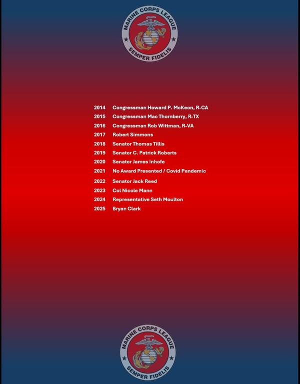 This award was conceived by the Marine Corps League for the purpose of recognizing annually that person who has contributed the most to the United States of America and the United States Marine Corps. Previous award winners include: